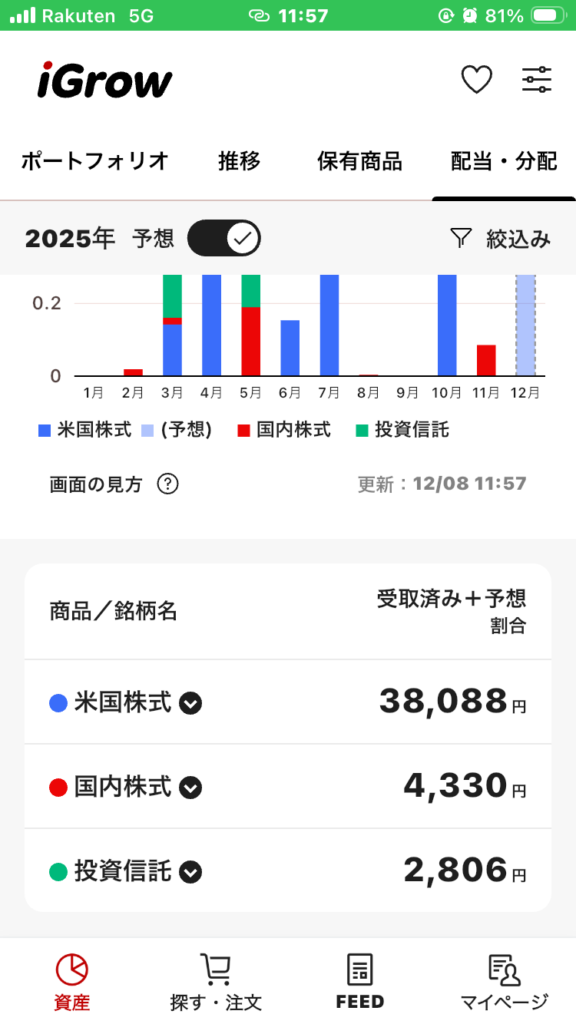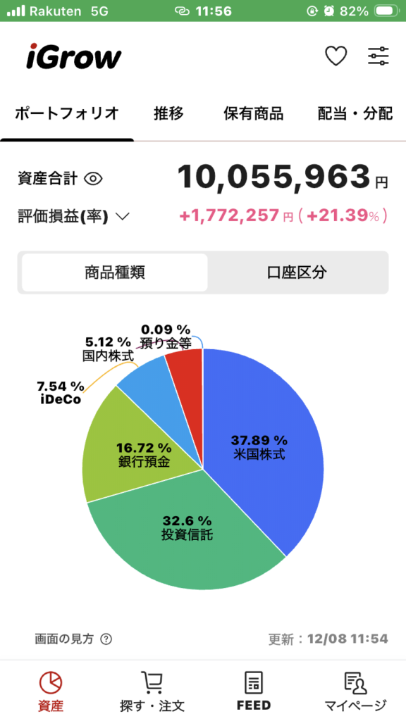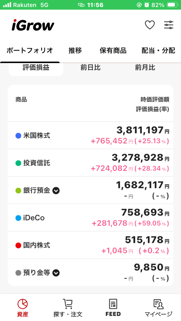 - iGrowで管理している株式・投資信託・iDeCo・預金の内訳